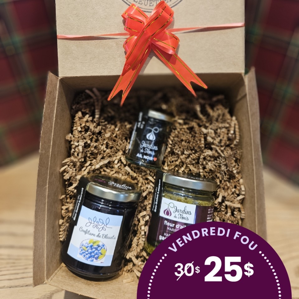 UN COFFRET QUI REGROUPE 3 DE NOS POPULAIRE PRODUITS . NOTRE AIL NOIR , CONFITURE DE BLEUETS ET NOTRE MERVEUILLEUSE FLEUR AIL MARINÉE